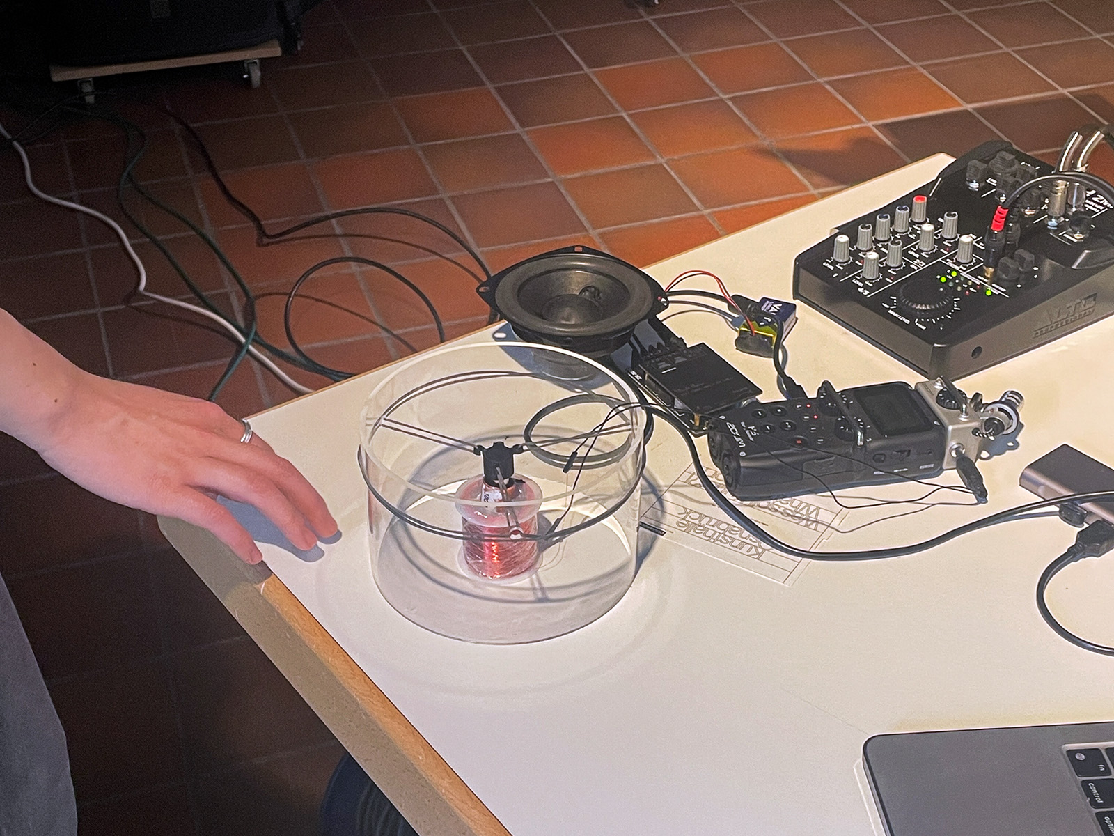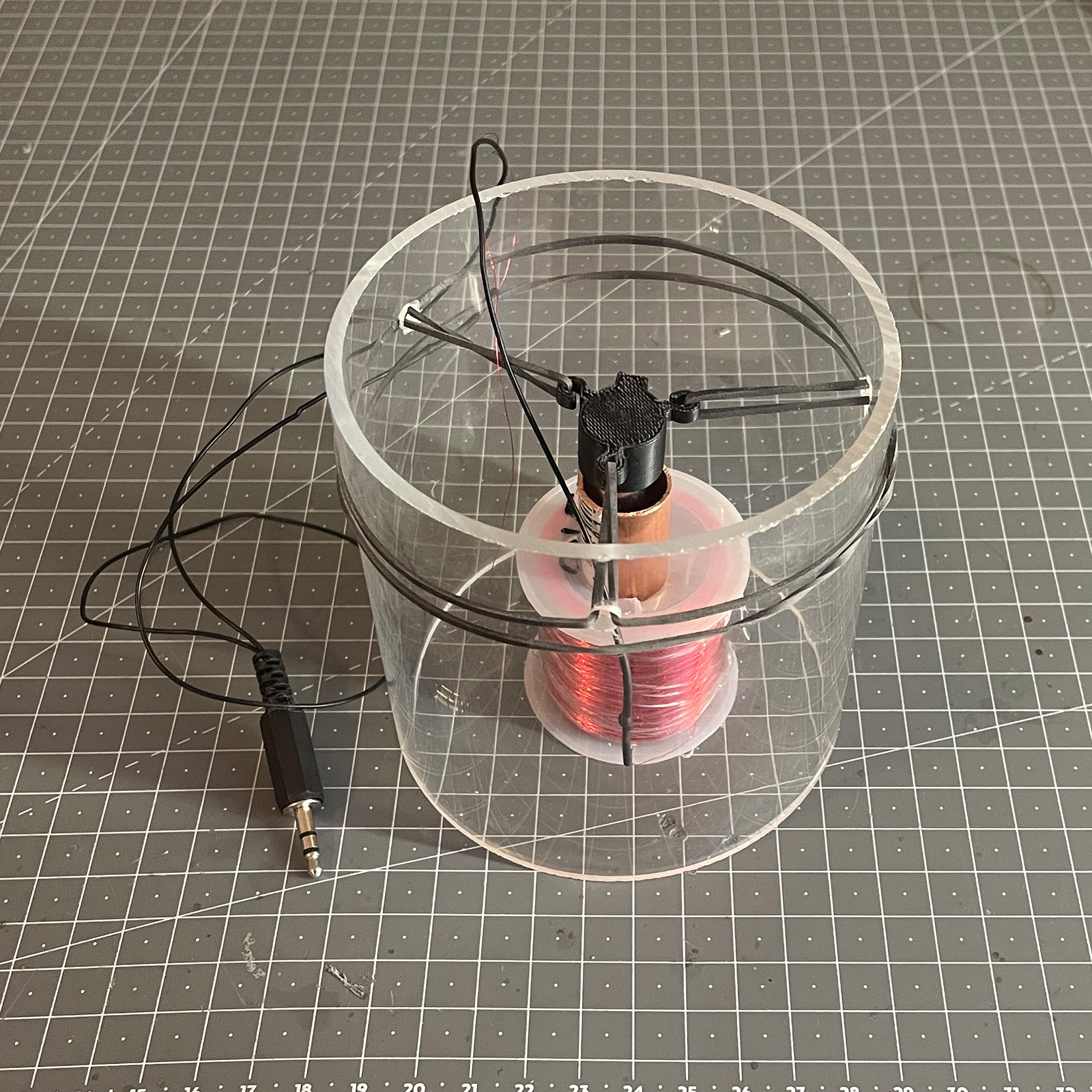 There is a big acrylic tube as a case (which I sourced very cheaply from https://hbholzmaus.de left over / scrap section). An elastic rubber band keeps the magnet holder in place that I modelled as well for 3D printing. A coil (0.15mm 600meters) is placed in the middle. The two ends of the coil are soldered each to a cable that leads to a 3.5mm audio jack. With a hole-enlarging drill bit I made a hole that is big enough for holding the copper tube. Then the magnet is fixed inside the magnet holder with a screw (or glued) and more or less awkwardly positioned in the copper tube. The big acrylic tube case keeps most of the wind out, so even though it looks very hacky, it actually worked quite nicely in the end. Ideally, you would put a lid on the top with a heavy weight on it, such as a brick or something. This way the pressure waves would propagate more easily through the material layers (ground -> acrylic case -> rubber band -> magnet inside the coil).